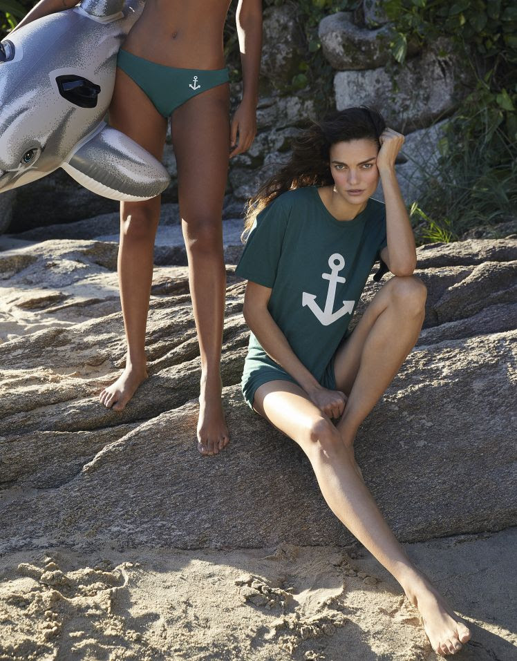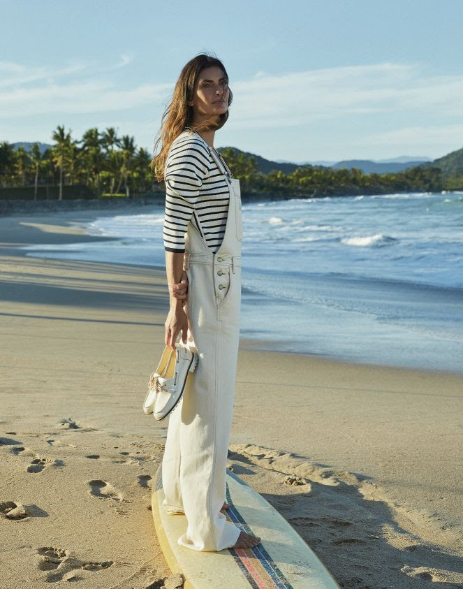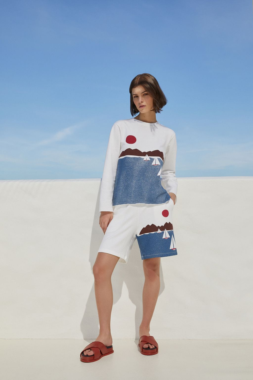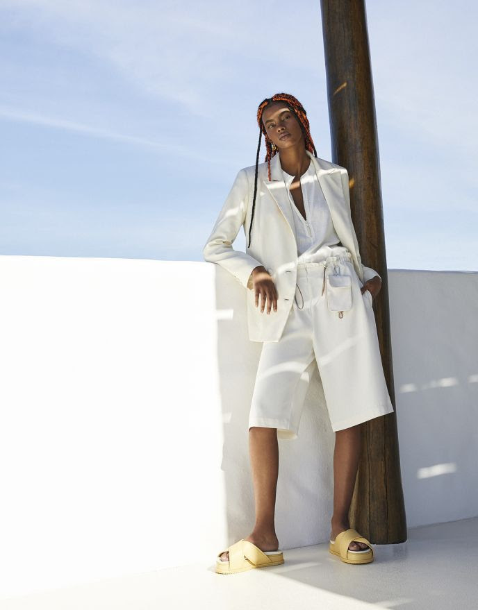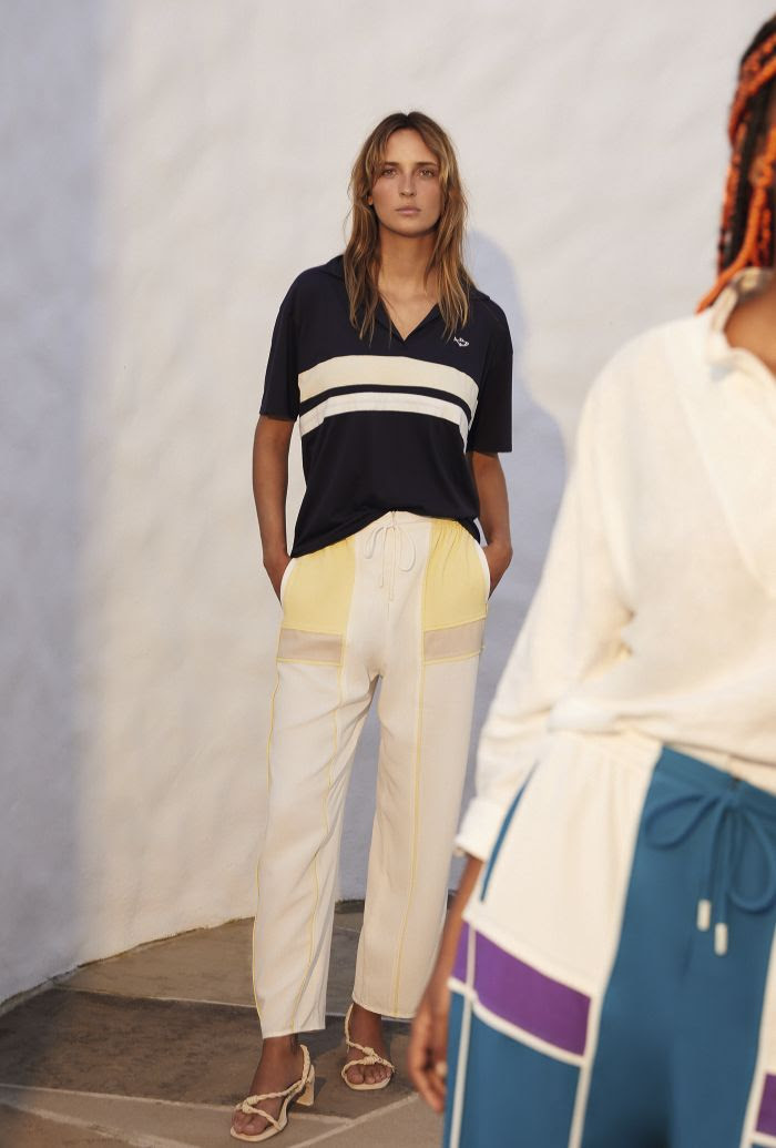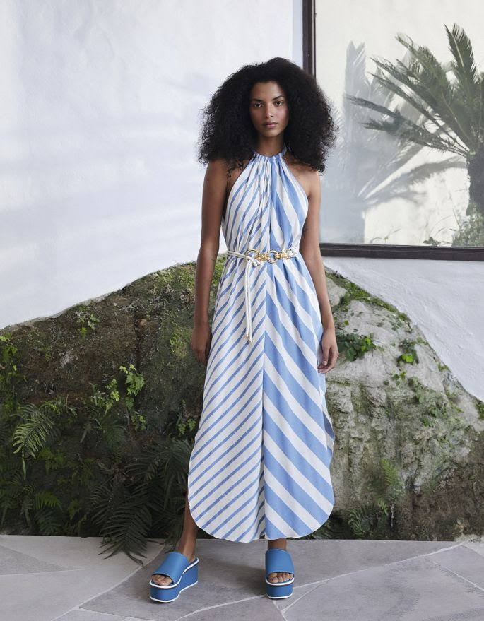 O mood náutico se destaca através de uma releitura dos códigos clássicos os tornando eternos e cool como no total look white com detalhes em azul marinho e estampa de âncora, no tricot marinheiro, no vestido listrado fluido e no conjunto branco bermuda e blazer, alfaiataria atemporal do verão. O alpinismo ganha uma homenagem moderna e feminina na forma de um vestido de alças em linho ou na versão azul “Rio” com mangas, ambos com cortes laterais e detalhes de corda fluor.