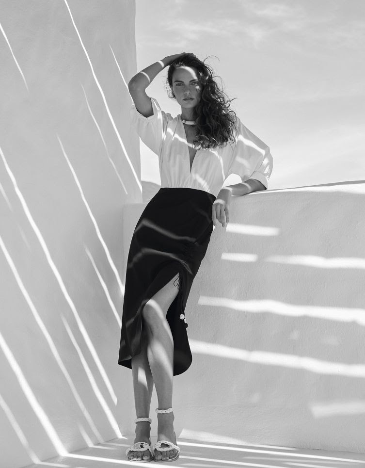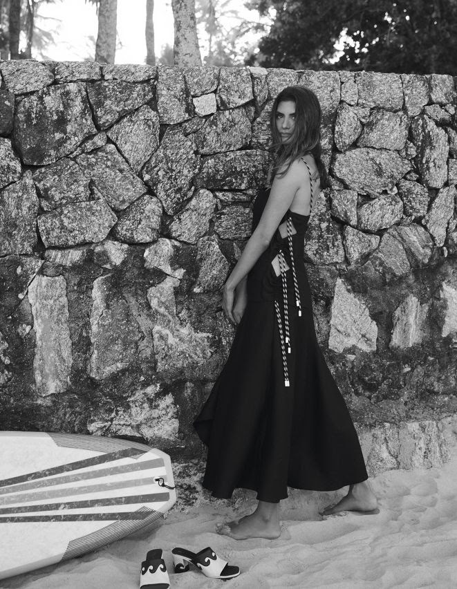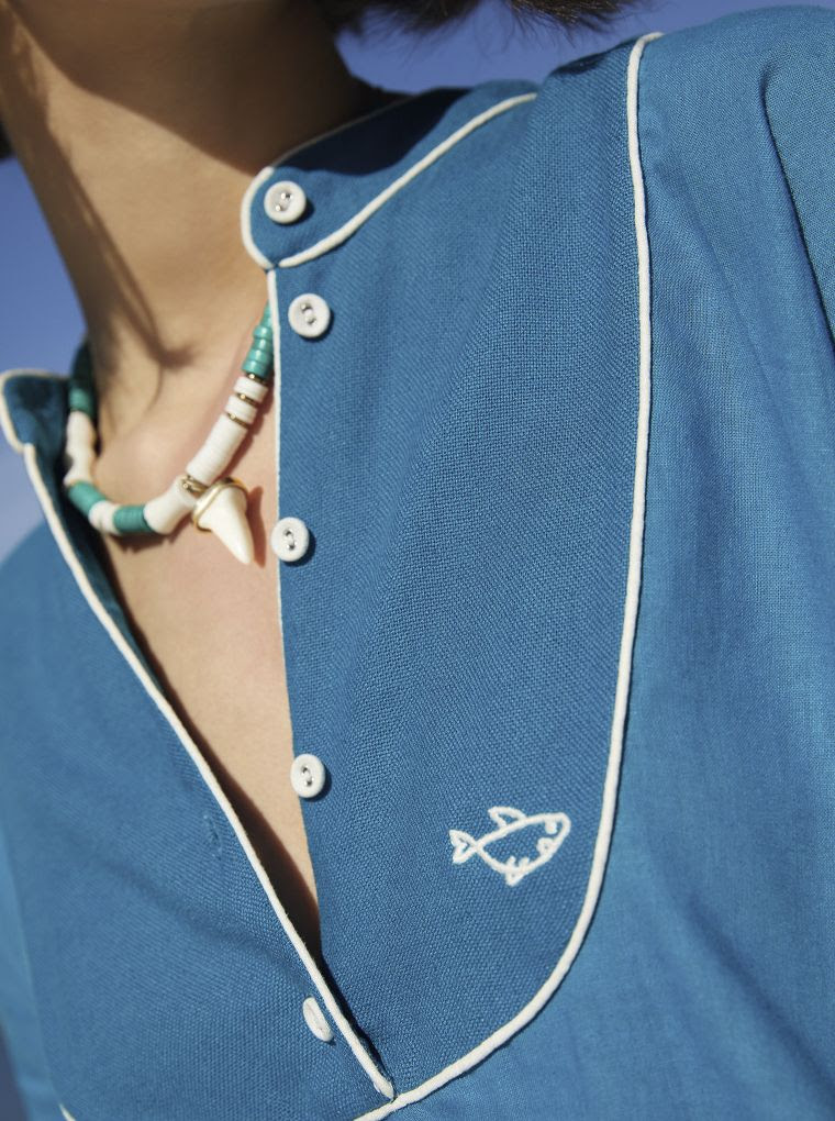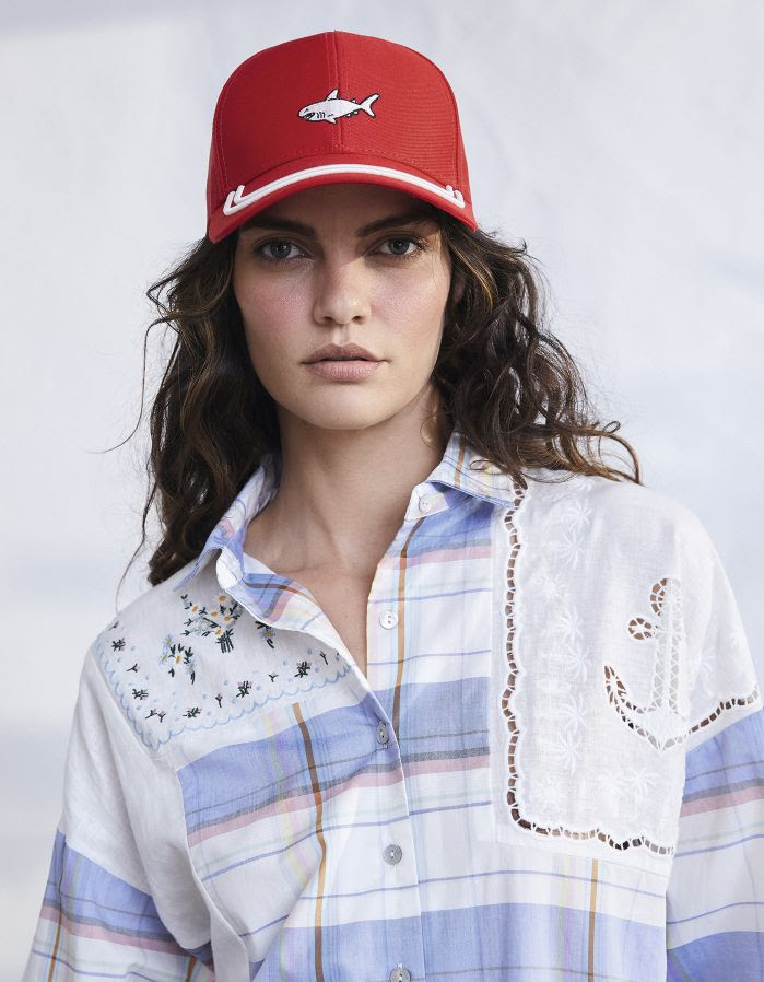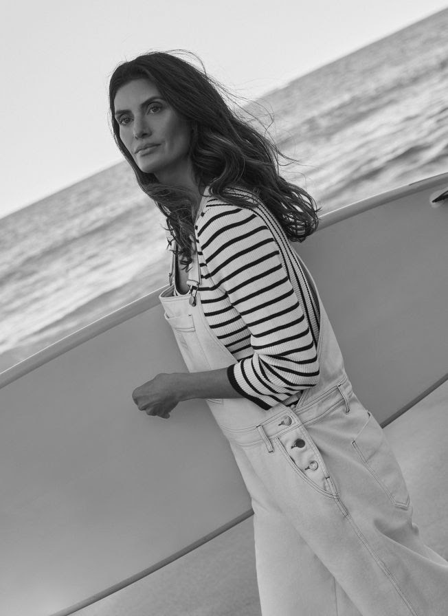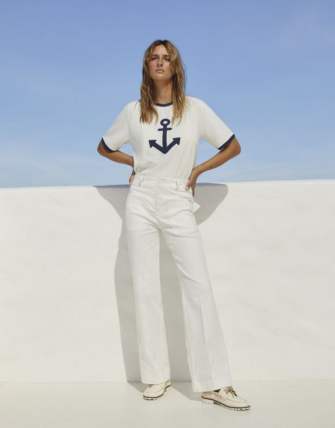 O mood náutico se destaca através de uma releitura dos códigos clássicos os tornando eternos e cool como no total look white com detalhes em azul marinho e estampa de âncora, no tricot marinheiro, no vestido listrado fluido e no conjunto branco bermuda e blazer, alfaiataria atemporal do verão. O alpinismo ganha uma homenagem moderna e feminina na forma de um vestido de alças em linho ou na versão azul “Rio” com mangas, ambos com cortes laterais e detalhes de corda fluor.