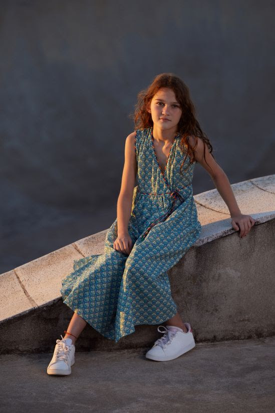 Bordados e estampas exclusivas desenvolvidos à mão merecem uma atenção especial em CRIS BARROS MINI, como o vestido verde inspirado na lendária rainha persa Sherazade, e o vestido transpassado azul com estampas de flores e amarração em corda.