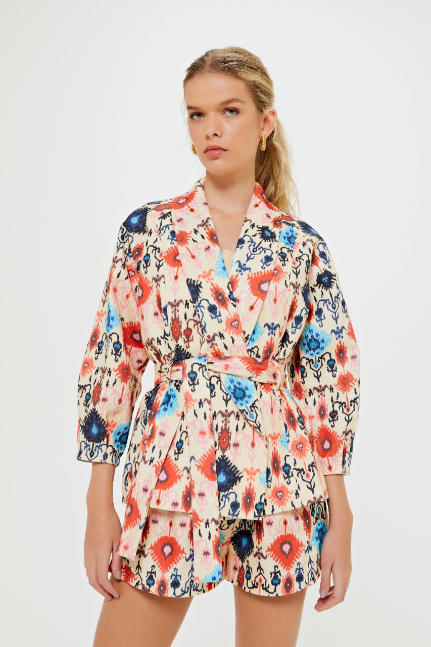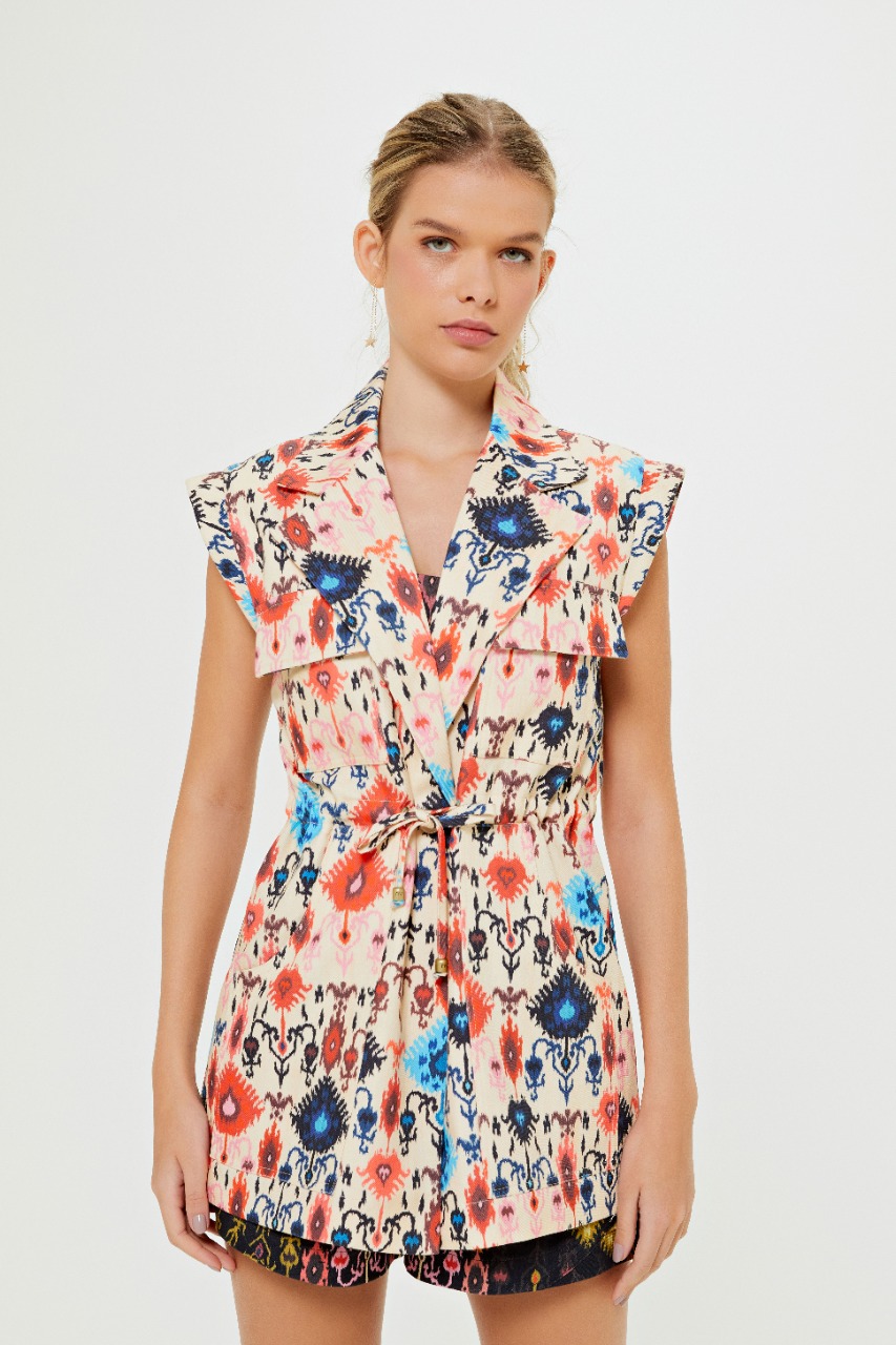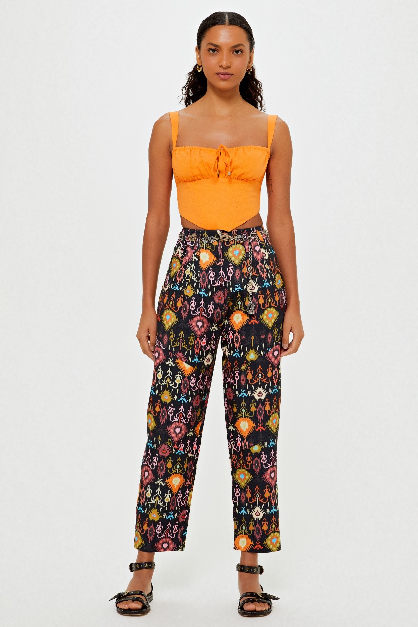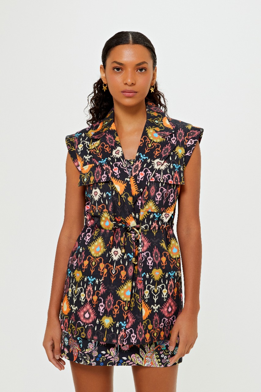 Para esta entrada, a marca traz duas variações de cores da mesma estampa, cream e preto, divididas em modelo de calça, shorts, cropped, vestido, casaco e colete, peça que vem ganhando cada vez mais destaque no armário das fashionistas. A estampa contou como inspiração o estilo boho com desenhos de elementos étnicos e versões do ikat com diferentes combinações de cores, como laranja, rosa, azul e amarelo, que se destacam tanto no fundo escuro quanto no claro dando total ênfase às cores. Descontraídas e atuais, o destaque dessa nova entrada fica por conta do design autoral, com peças modernas e fashionistas, característica da marca que se reforça a cada nova estação.