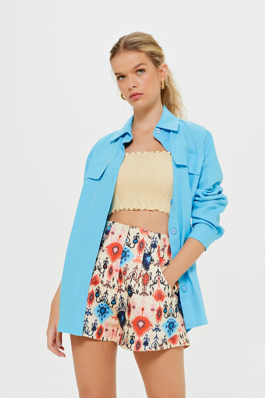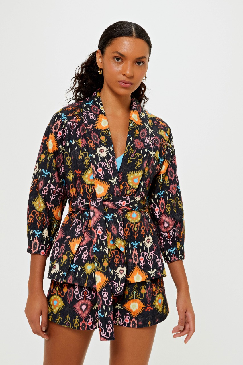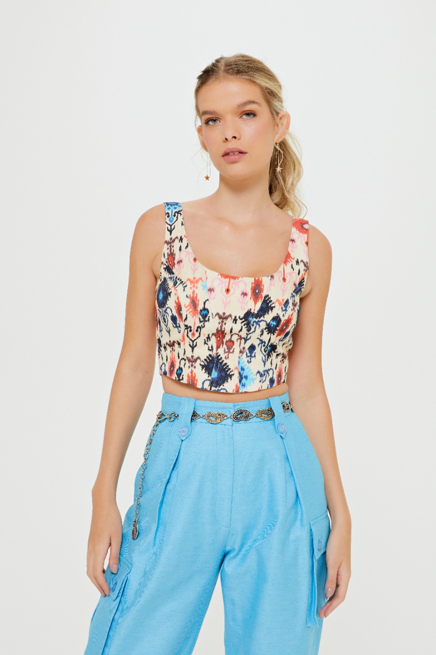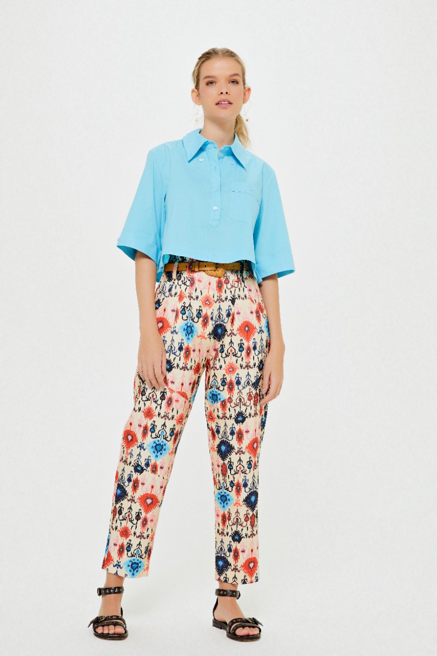 Para esta entrada, a marca traz duas variações de cores da mesma estampa, cream e preto, divididas em modelo de calça, shorts, cropped, vestido, casaco e colete, peça que vem ganhando cada vez mais destaque no armário das fashionistas. A estampa contou como inspiração o estilo boho com desenhos de elementos étnicos e versões do ikat com diferentes combinações de cores, como laranja, rosa, azul e amarelo, que se destacam tanto no fundo escuro quanto no claro dando total ênfase às cores. Descontraídas e atuais, o destaque dessa nova entrada fica por conta do design autoral, com peças modernas e fashionistas, característica da marca que se reforça a cada nova estação.