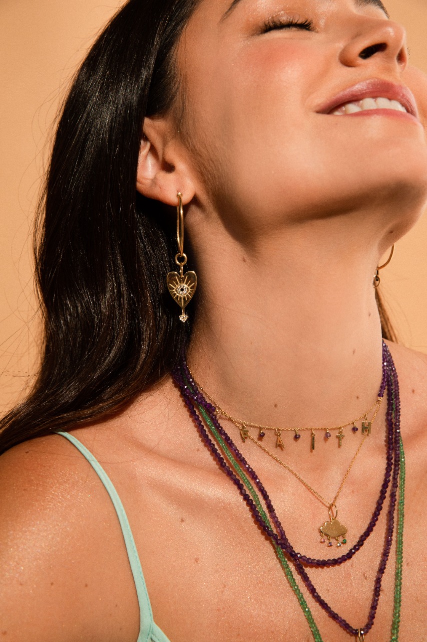 Rubis, safiras, turmalinas e amazonitas são as pedras protagonistas desta segunda collab, que têm como destaque as argolas com pingentes e rivieras. Também são apresentados amuletos de proteção – marca registrada da TAU – como olho grego, Maneki-neko e trevo da sorte em ouro amarelo, branco e rosé 18k em diversos shapes, além de charms de ursinho, cogumelo e nuvem. As medalhas apresentam a frase “I love you to the moon… and back” em homenagem ao seu filho.